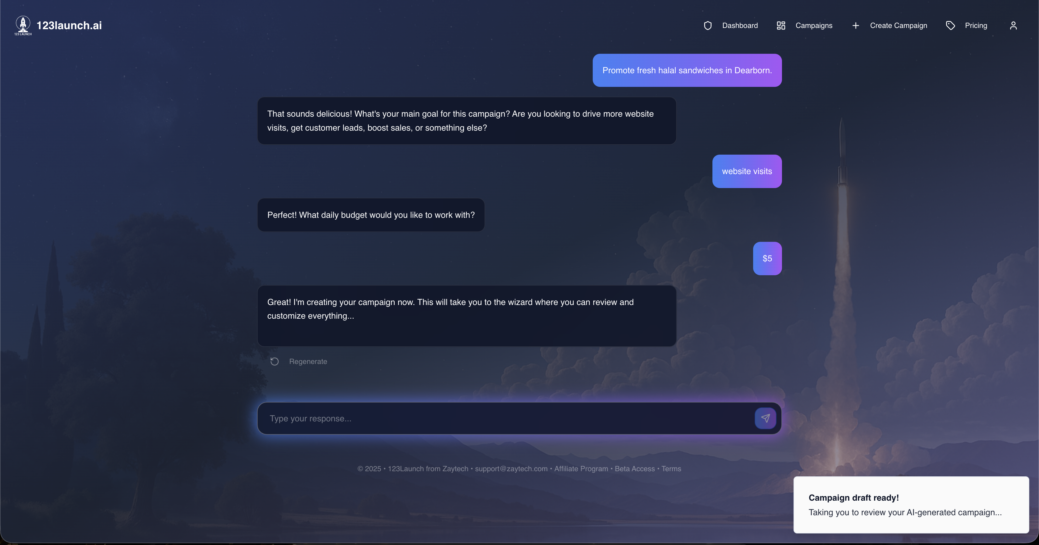 Imagine you own a halal sandwich shop in Dearborn and want to attract more lunchtime customers. Instead of hiring a marketing agency or spending hours learning how to use Facebook Ads Manager, you open 123launch.ai.
