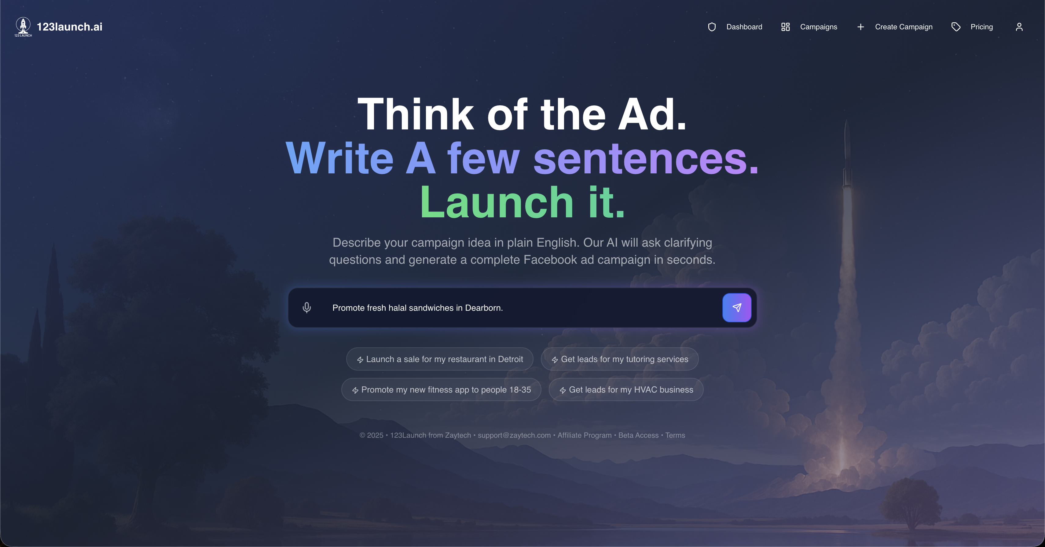 Start by visiting 123launch.ai. Type a short description of your product or service. This can be as simple as:
